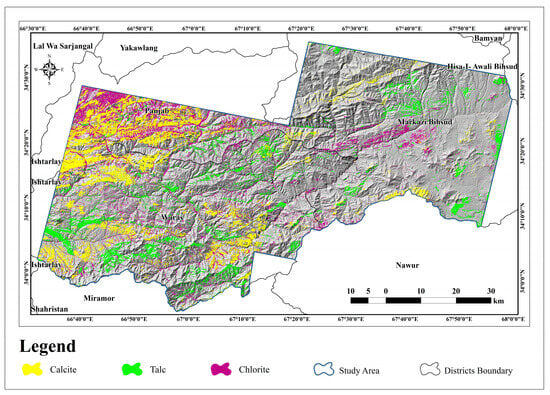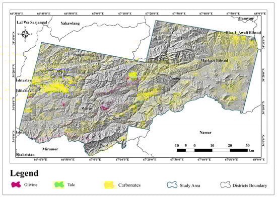 The distribution of mafic-ultramafic occurrences identified through the PCA approach aligns with the findings of other spectral analyses that were investigated. Moreover, PCA was also employed to identify carbonate minerals, talc, and chlorite, as delineated in Table 5. Bands 3, 4, 8, and 9 from ASTER data were thoughtfully selected for calcite identification, while bands 1, 4, 8, and 9 were chosen for talc, and bands 2, 3, 5, and 6 were specifically utilized for chlorite in the PCA analysis, as outlined in Table 5. As illustrated in Figure 11, this approach demonstrated its efficacy in identifying promising lithologies. The lithology was successfully pinpointed within regions characterized by the distribution of mafic-ultramafic rocks, underscoring the method’s reliability. Notably, carbonates were detected in the northwestern portion of this study area, specifically within the Panjab district, where they exhibit clear associations with other mafic-ultramafic rocks.