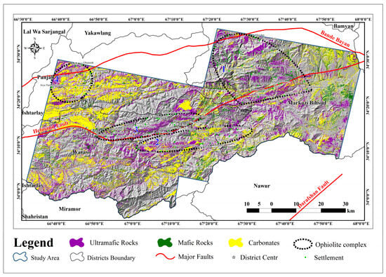 Spatial distribution of mafic-ultramafic rock formations (ophiolites) and carbonate formations identified through the utilization of BR, PCA, and SAM algorithms applied to ASTER data within this study area.