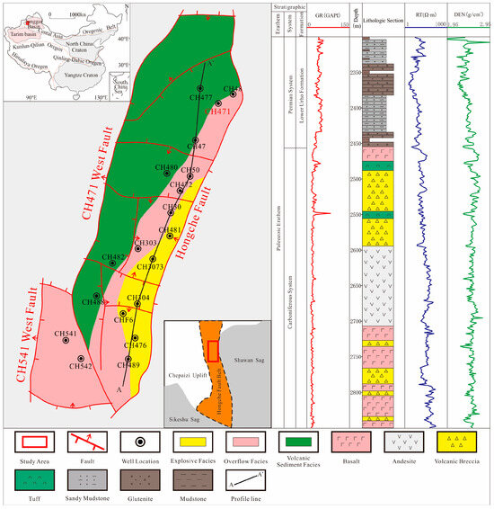 Through observations of more than 200 m of Carboniferous volcanic rock cores and identification of corresponding rock thin sections, combined with a comparative analysis of logging data, the volcanic facies in the study area are mainly divided into volcanic sedimentary facies, overflow facies, and explosive facies. The lithology mainly consists of tuffaceous sandstone, tuff, andesite, basalt, and volcanic breccia. Laterally, the Carboniferous volcanic rocks are distributed in a southwest–northeast strip shape with good continuity and rapidly pinch out from east to west (Figure 1).
