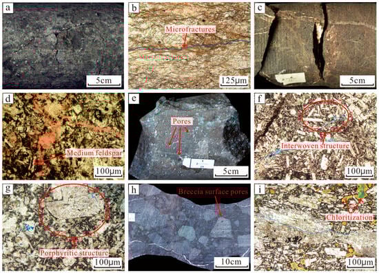 Lithological characteristics of Carboniferous volcanic rocks. (a) Tuff, CH545, 2097.84–2098.3 m; (b) Tuff structure and microfractures, CH545, 2097.84 m; (c) Andesite, CH47, 2770.97–2771.15 m; (d) Andesite with interwoven structure with visible medium feldspar, CH47, 2770.97 m. (e) Basalt with visible stomatal development, CH471, 2630.59–2630.72 m. (f) Half-filling fractures and oil spots can be seen in basalt, CH471, 2630.59 m. (g) Basalt, Porphyritic structure, CH471, 2633.75 m. (h) Some breccia surface pores are developed, CH472, 2627.35–2627.69 m. (i) The basaltic andesitic breccia has breccia and interweaving structures, CH472, 2627.35 m.