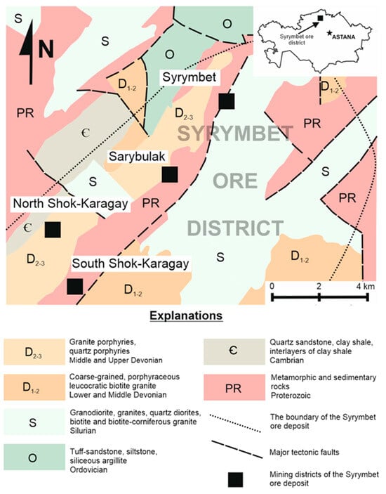 Geology of the Syrymbet ore field (simplified). PR—Zerendy series: gneiss, amphibolites, and crystalline schist; Sharyk suite: carbonaceous–clayey, siliceous–argillaceous slate, sandstone, limestone, interbedding quartzite, quartz sandstones, siltstones, and limestone lenses; Cm—Andreev suite: quartz sandstone, clay shale, and interlayers of clay shale; O—tuff–sandstone, siltstone, and siliceous argillite; S—granodiorite, granites, quartz diorites, biotite, and biotite–corniferous granite; D1–2—coarse-grained, sometimes porphyraceous leucocratic biotite granite; D2–3—granite porphyries and quartz porphyries [23].