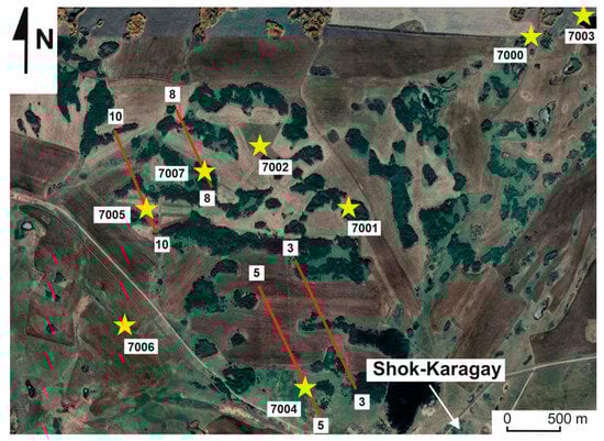 Location of exploration wells (points 7001–7007) overlaid on a geological map of the Shok-Karagay deposit. Scale: 1:25,000. Schemes follow the same formatting (Google Maps) [23]. Red lines: cross-sections. Yellow stars: sampling points.