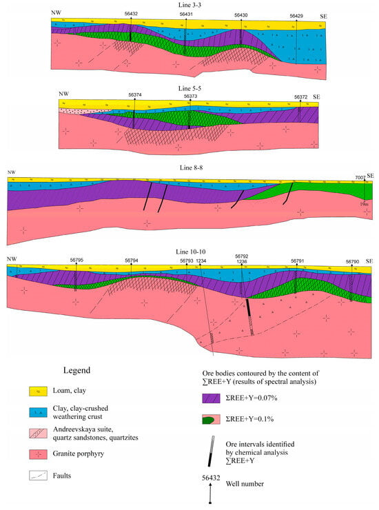 Geology of the Syrymbet ore field, simplified from Raport (2019) [23]. Lines 3–3, 5–5, 8–8, and 10–10 show profiles selected for investigation and exploration (constructed alongside lines showed in Figure 2), with the ore bodies contoured by the sum of REE and yttrium quantities.