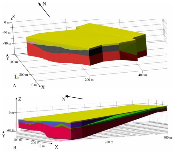 Three-dimensional lithological model of the structure of the deposit. (A) Shok-Karagay South: yellow—blanket deposits; green and dark grey—ore-bearing weathering crust; pink—quartz sandstones and quartzites; red—intrusion. (B) Shok-Karagay North: yellow—blanket deposits; blue—clay and clay-crushed weathering crust; green and purple—ore-bearing weathering crust; red—intrusion.