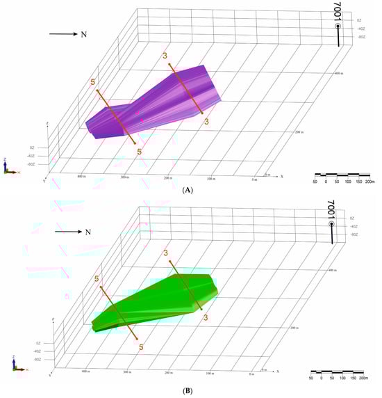 Three-dimensional wireframe model of ore bodies with different REE contents: (A) green—0.1 wt.%; (B) purple—0.07 wt.%.