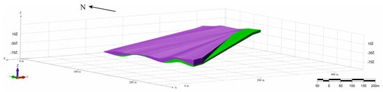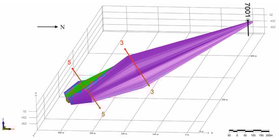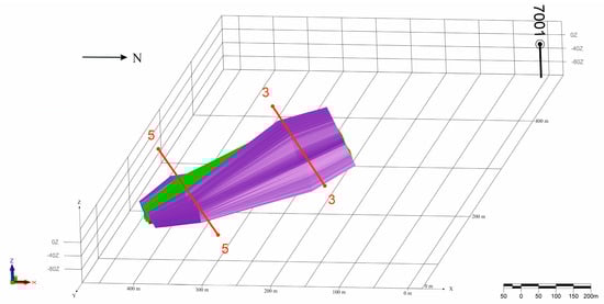 Three-dimensional model of an ore body viewed with prospective areas of different REE contents: green—0.1% of total REEs and purple—0.07% of total REEs. The structures of the bed of deposits were modelled along the 5–5 and 3–3 cross-sections with cut–offs of 0.07% and 0.10 wt.% REEs; a wedge shape of the bed was indicated, oriented towards the SW–NE direction with a thickness ranging from 40 to 1800 m.