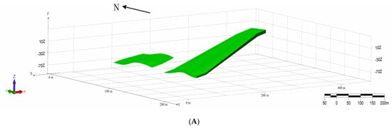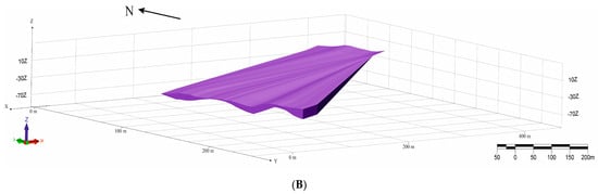 (A,B) Three-dimensional wireframe models of ore bodies in the southern section of Shok-Karagay with different REE grades ((A)—0.07 wt.%, (B)—0.10 wt.%) running through exploration profiles 3–3 and 5–5. The contours of the ore bodies indicated high regularities and a homogenous structure, with thicknesses reaching 40 m and lengths reaching 350 m.
