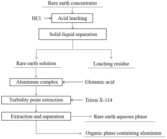 A certain mass of glutamic acid was added to the leaching solution, and the mixed solution was placed onto a constant temperature magnetic stirring table. The pH of the solution was adjusted, and an appropriate amount of Triton X-114 was added after a certain time. The solution was heated to a certain temperature for a period of time, and aluminum ions were extracted to separate the aluminum and rare earth ions in the solution. The experimental flow chart is shown in Figure 1.