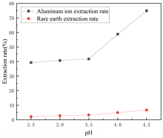 The effect of pH on the extraction rate of aluminum ions and rare earth ions. (n (Al3+): n (glutamic acid) = 1:3, volume ratio of rare earth to Triton X-114 is 5:1, T = 40 °C, the reaction time is 20 min).