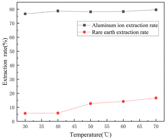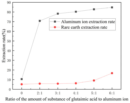As shown in Figure 3, the extraction rate of rare earth ions increases with the increase of temperature. The temperature has little effect on the extraction rate of aluminum ions. With an increase in temperature, the excess glutamic acid in the solution starts to combine with rare earth ions; the complexation of rare earth ions with glutamic acid requires higher temperatures. Therefore, the extraction of rare earth ions is easier at high temperatures. The high reaction temperature therefore affects the coordinating ability of the glutamic acid complexation reaction, further increasing energy consumption and costs. A reaction temperature of 40 °C appears to be the most suitable.