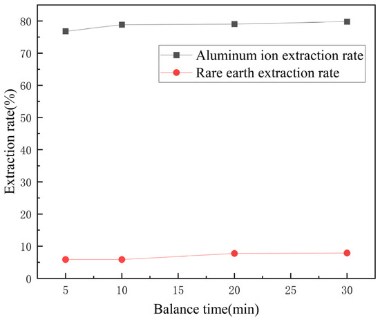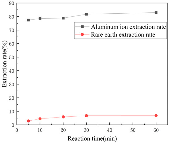 As seen from Figure 6, when the constant temperature reaction is carried out over 10 min, the extraction rate of aluminum ions in rare earth solutions can reach 78.56%, while the extraction rate of rare earth ions is only 4.45%. Thus, the use of a constant temperature over a 10 min reaction time can remove the aluminum ions in the rare earth solution most effectively. As the reaction time increases, there is no significant change in the extraction rate of aluminum ions and rare earth ions, which indicates that the rate of glutamic acid and aluminum ion complexation is high and that a controlled reaction time of 10 min is suitable for this operation.