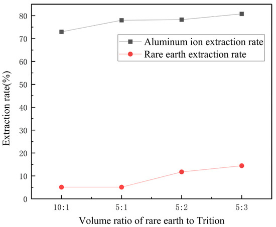 From Figure 7 and comparing Figure 13 and Figure 14, it can be seen that when the solution contains both rare earth ions and Al3+, the extraction rate of aluminum ions from the mixed solution is essentially the same as that of the solution containing only Al3+. The extraction rate of rare earth ions from the mixed solution is much lower than that of the single rare earth solution. This indicates that when the solution contains both aluminum ions and rare earth ions, the addition of a quantitative extractant will result in the preferential extraction of the aluminum ion complex.