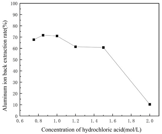 As shown in Figure 8, the initial concentration of hydrochloric acid was too high, resulting in almost no back-extraction of aluminum ions from the organic phase. Hydrochloric acid dissolves most of the organic phase, making phase separation difficult. The acidity of hydrochloric acid decreases, and the reverse extraction rate of aluminum ions increases. When the added hydrochloric acid is 1.0 mol/L hydrochloric acid, 72% of the aluminum ions in the system are reverse extracted. Therefore, the use of 1.0 mol/L hydrochloric acid as the reverse extraction is most beneficial to the process.