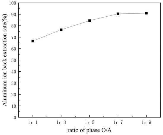As shown in Figure 9, the volume of the organic phase remained unchanged, and the reverse extraction rate of the aluminum ion in the organic phase increased with the increase of the O/A ratio, and there was no further change after 1:7. This is because as the O/A ratio decreases, the contact area between the organic phase and the aqueous phase also increases, making the efficiency of the reverse extraction more pronounced. When O/A = 1:7, the back extraction rate of aluminum ions in the organic phase can reach 90.42%, and past this point, the back extraction rate of aluminum ions remains basically unchanged. Therefore, O/A = 1:7 is a suitable volume ratio.