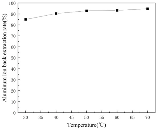 As shown in Figure 10, the reverse extraction rate of aluminum ions in the organic phase remains essentially unchanged as the temperature increases. This is due to the lower temperature requirement of the reverse extraction process. When the temperature is 40 °C, the reverse extraction rate of aluminum ions in the organic phase reaches 90.56%. Beyond this temperature, the reverse extraction rate of aluminum ions remains basically unchanged, and higher temperatures only further increase energy consumption and costs. Therefore, choosing a reaction temperature of 40 °C is the most suitable.
