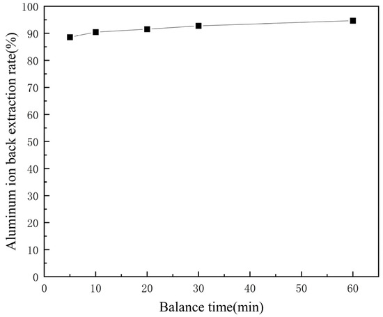 It can be seen from Figure 11 that reaction time has little influence on the back extraction rate of aluminum ions in organic phase. This indicates that the length of the equilibration time has a negligible effect on the reverse extraction experiment. After 10 min of equilibration, the reverse extraction rate of aluminum ions in the organic phase reaches 90.46%; therefore, a balance time of 10 min was chosen as the most appropriate.