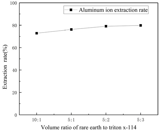 As shown in Figure 13, in the aqueous solution with an Al3+ concentration of 2.89 g/L, the aluminum ion extraction efficiency is 62.85% when 5 mL Triton X-114 is added, and the concentration of extracted Al3+ in the organic phase is 1.861 g/L. When the Triton X-114 is increased in volume, the extraction rate of Al3+ also increases gradually. When 20 mL of Triton X-114 was added, the extraction rate of aluminum ions reached 76.09%, and the concentration of extracted aluminum ions in the organic phase was 2.198 g/L. The amount of Triton X-114 was further increased to 30 mL, at which point the extraction rate of aluminum ions was 77.85%, whereas the concentration of extracted aluminum ions in the organic phase was 2.249 g/L. This indicates that beyond a certain addition level of Triton X-114, the extraction rate of Al3+ in the solution remains basically unchanged.