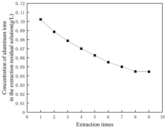 As shown in Figure 16, the content of aluminum ions in the extracted residue gradually decreased with an increase in the number of extractions; the extracted residue was extracted with the fresh organic phase several times. The concentration of aluminum ions in the extracted residue remained mostly unchanged after eight extractions. When cAl = 0.045 ± 0.003 g/L, Figure 17 shows that as the number of extractions increases, the content of Al3+ in the solution gradually decreases. The newly added complexing agent begins to react with a large number of rare earth ions, leading to the extraction of a large number of rare earth ions. The separation coefficients of Al and RE in solution were investigated, and the results were as follows, reaching an extraction minimum: