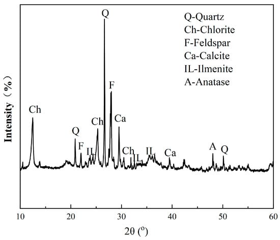 The XRD pattern of the raw ore is presented in Figure 1. A mineral content analysis was conducted using various methods, including microscopy, an electron microscope analysis, and an XRD analysis. Table 2 shows the mineral contents of the ore, indicating that the major industrial Fe- and Ti-bearing minerals’ contents were extremely low. The content of titanomagnetite was only 1%, which is the primary target mineral for Fe separation. The main Ti-bearing minerals were anatase and ilmenite, with concentrations of 4.21% and 2.71%, respectively. The main gangue minerals were chlorite, feldspar, quartz, and calcite, etc., with chlorite having a high content of 41.13%. The amounts of chlorite and transition phase from anatase to chlorite suggest severe alteration of the ore.