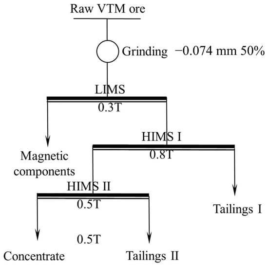 High-intensity magnetic separation (HIMS) was carried out using an SLon-500 high gradient magnetic separator(Slon Magnetic Separator Co., Ltd., Ganzhou, China). Magnetic components, including titanomagnetite and other substances in the ore, were removed via LIMS before HIMS. A flowsheet of the experiment is displayed in Figure 2.
