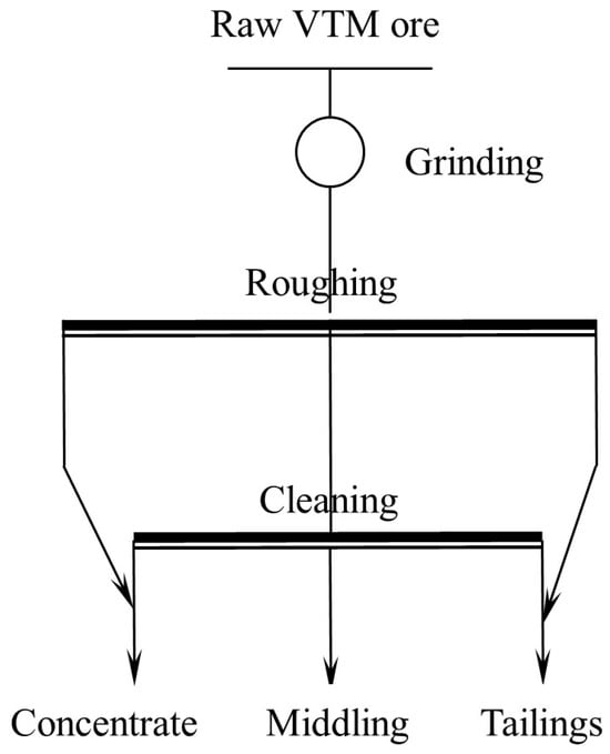 Gravity separation was performed using an XZYK-1000 × 6000 shaking table (Sichuan 102 Machinery manufacturing Co., Ltd., Xichang, China). The raw VTM ore was first ground to different fineness, and then fed into gravity separation. The heavy minerals were recovered as a pre-concentrate, enriching the Ti-bearing minerals. A flowsheet of gravity separation experiment is presented in Figure 3.