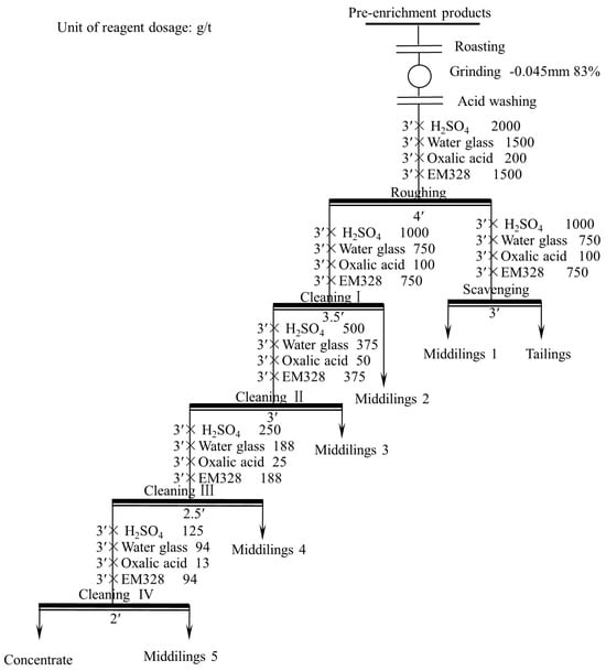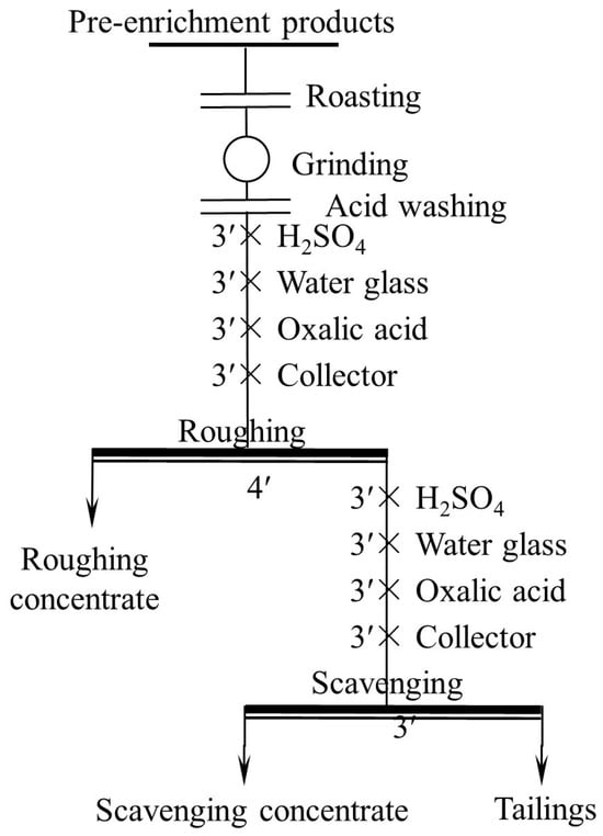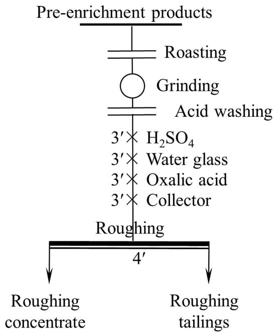 The roasting process was conducted in a laboratory muffle furnace. After the furnace was heated to the desired temperature, a crucible filled with 300 g of ore sample was placed in the furnace, injected with air through a tube in advance. The time of roasting was 2 h. When the furnace was cooled to room temperature, the crucible was removed from the furnace. The acid washing process was carried out using an XFG-type flotation machine with a 1.5 L cell. In each process, 300 g of ground ore sample and 1.5 L of 5 wt.% H2SO4 were placed in the cell and fully agitated for 1 h. The sample was then rinsed 3 times with water to remove residual acid, then filtered and dried. The effect of both pretreatment methods was tested by flotation, of which the flowsheet is one roughing (Figure 4).