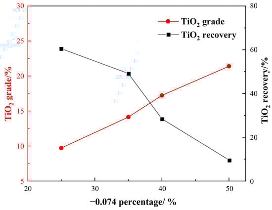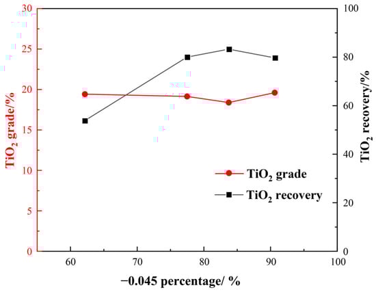Grinding fineness plays a crucial role in determining beneficiation, especially considering that Ti-bearing minerals have very fine particle sizes. Hence, we first investigated the impact of grinding fineness on flotation indexes under the following conditions: a H2SO4 dosage of 2000 g/t, a water glass dosage of 1500 g/t, an oxalic acid dosage of 200 g/t, and an EM328 dosage of 1500 g/t. The effect of grinding fineness on flotation is shown in Figure 9.