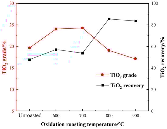It can be seen from Figure 7 that the TiO2 recovery of the flotation concentrate gradually increased, especially reaching 85.56% at 800 °C, while the TiO2 grade significantly improved after roasting at 600–700 °C, and gradually decreased over 800 °C. After the temperature reached 900 °C, the TiO2 grade had a downward trend, and the recovery decreased slightly. Therefore, the roasting pretreatment increased the flotation indexes obviously. Taking into account of the recovery and grade, an oxidation roasting temperature of 800 °C was selected.
