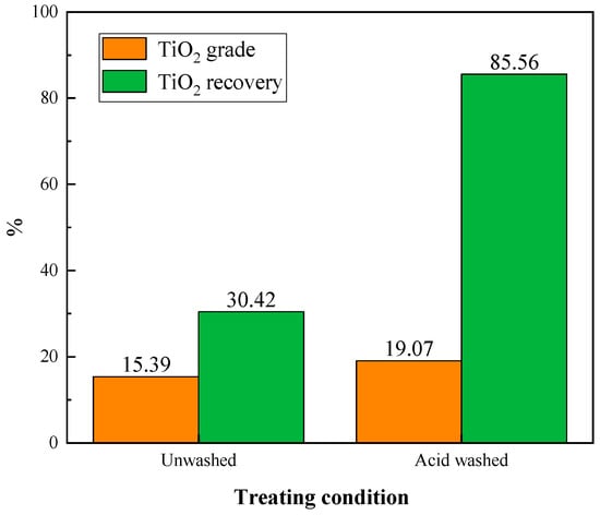 From Figure 8, it can be seen that the acid washing pretreatment dramatically improved the grade and recovery of the TiO2 during flotation. The untreated sample obtained a TiO2 grade of 15.39% and recovery of 30.42% flotation concentrate. In comparison, the acid-washed sample yielded a TiO2 grade of 19.07% and recovery of 85.56% concentrate. Therefore, acid washing treatment prior to flotation could enhance the flotation efficiency of Ti-bearing minerals.