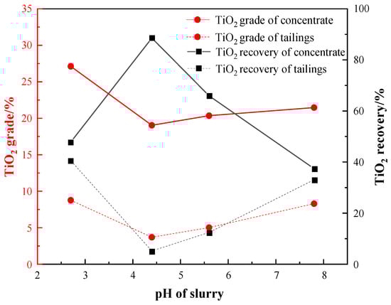 The results presented in Figure 10 indicate that the TiO2 recovery of the roughing concentrate increased initially and then decreased with the pH decreasing after reaching a maximum value of 88.58% at pH 4.4. Under this condition, the grades of the TiO2 in the concentrate and tailings were 19.04% and 3.69%, respectively. This was due to the narrow optimal pH condition for Ti-bearing minerals’ flotation, usually around 4–5, which is consistent with other studies [,]. Therefore, a roughing pH of 4.4 was selected as the optimal condition when using a sulfuric acid dosage of 2000 g/t.