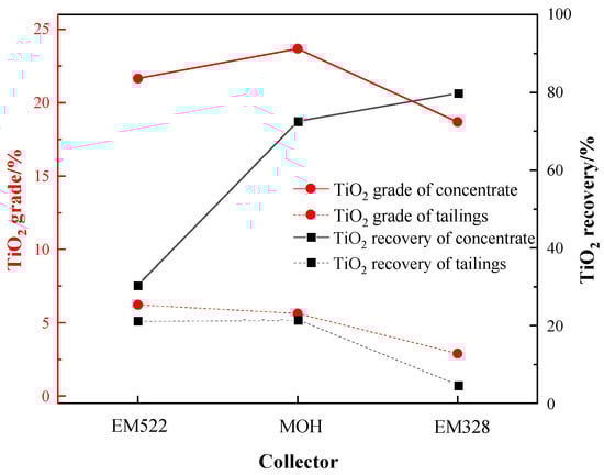 As shown in Figure 13, it can be observed that, at the same collector dosage, EM522 yielded a roughing concentrate with a TiO2 grade of 21.65%, while MOH produced a concentrate with a TiO2 grade of 23.68%. However, both these collectors resulted in more than 20% TiO2 in the tailings, i.e., remaining unrecovered. In comparison, when EM328 was used as a collector, a roughing concentrate with TiO2 grade of 18.69% and recovery of 79.80% could be obtained. Furthermore, the TiO2 grade in the tailings was significantly lower, measuring only 2.90%. In overall consideration, EM328 was selected as the preferred collector for the flotation of the sample.