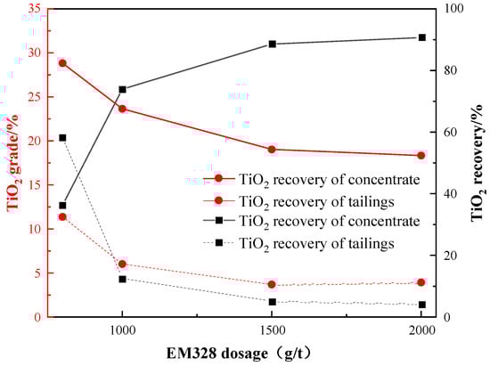 Then, under the given conditions of a grinding fineness of −0.045 mm 83%, a sulfuric acid dosage of 2000 g/t, a water glass dosage of 1500 g/t, and an oxalic acid dosage of 200 g/t, an investigation was conducted to examine the effect of EM328 dosage on the flotation of Ti-bearing minerals. The results are presented in Figure 14.
