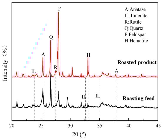Figure 16 shows the XRD patterns of the roasting feed and roasted product. The most intense diffraction peak of anatase at 2θ = 25.31° was significantly enhanced when the sample was roasted at 800 °C. There were also increases in the peaks at 2θ = 27.44°, 36.09°, and 37.80°, which are attributed to rutile and anatase, respectively. The peaks at 2θ = 32.59°, 35.29°, and 23.83° all weakened or disappeared to varying degrees. The diffraction peak of hematite at 2θ = 33.12° showed an enhancement. It can be concluded that the ilmenite in the ore was converted to anatase and rutile during the roasting process, while hematite was formed simultaneously [,]. It is also consistent with the fact that flotation indexes are better after roasting, because anatase and rutile possess a better floatability than ilmenite [].