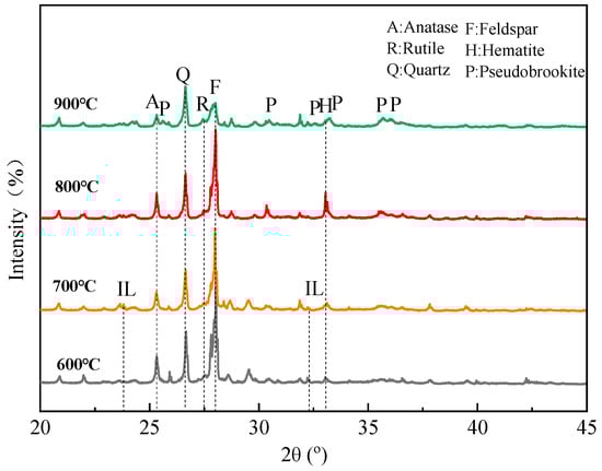 The XRD patterns of the roasted product at different temperatures are shown in Figure 17. It is observed that weak diffraction peaks of ilmenite appear at 600–700 °C, but they almost disappear at 800–900 °C. With the temperature increasing, the peaks of anatase, rutile, and hematite become more prominent. It is noteworthy that the contents of anatase and hematite reach a maximum at 800 °C, followed by a decline at 900 °C. Meanwhile, the formation of pseudobrookite (Fe2TiO5) begins at 900 °C. That is, ilmenite converts into anatase and rutile at 600–800 °C, but pseudobrookite begins to form by combining hematite, anatase, and rutile at 900 °C, which is harmful to the flotation. These phase changes are in good agreement with the other literature []. The changes also explain the flotation phenomenon that 800 °C is the optimal roasting temperature.