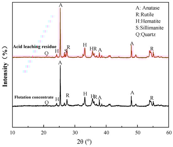 The flotation concentrate and acid leaching residue were subjected to XRD to determine the mineral contents. As seen in Figure 18, the main contents of the both products were anatase, followed by rutile and hematite. However, compared to the flotation concentrate, the contents of Ti-bearing minerals, anatase, and rutile were significantly increased in the acid leaching residue. It was observed that a small amount of sillimanite was generated in the leaching process, together with a decrease in quartz, probably due to the reaction between acid and quartz in the concentrate. These results agree with the chemical analysis in Section 3.4.