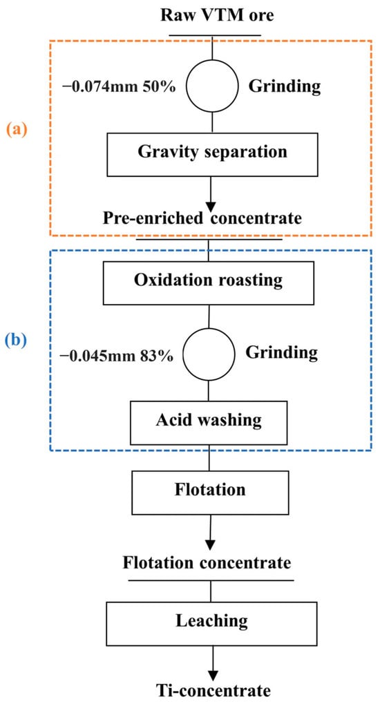 Principle flowsheet of Ti-concentrate production process from the altered VTM ore ((a): pre-concentration and (b): pretreatment).