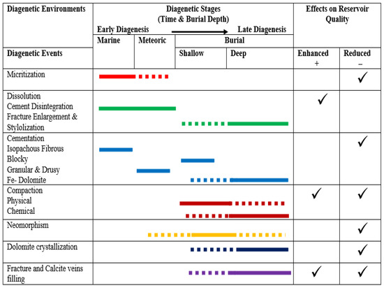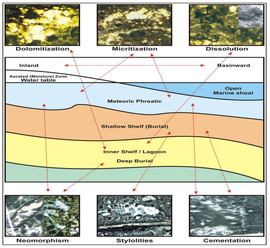 - Several diagenetic processes, including micritization, cementation, and neomorphism, have had a detrimental impact on the reservoir quality during different diagenetic phases, such as marine, meteoric, and burial diagenesis. Conversely, dissolution, chemical compaction, and fracturing have enhanced the secondary porosity and permeability, which, in turn, are subsequently reduced by induced calcite cementation and the intermix of clay minerals, as described in Figure 5. This interplay of diagenetic processes significantly increases the reservoir heterogeneity, which ultimately affects the reservoir performance.