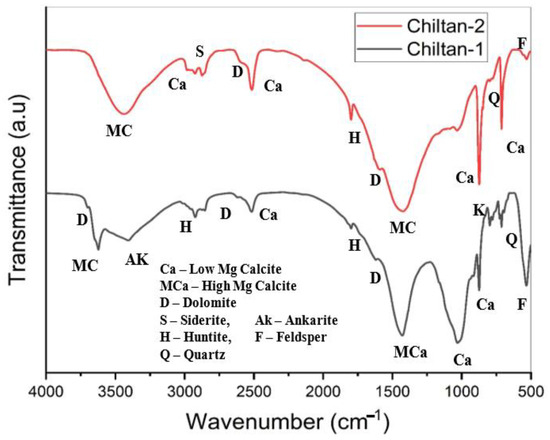 The mineral constituents of Chiltan limestone were analyzed through SEM-EDS, FTIR, and thin sections. The observed mineralogy of the examined samples contains calcite, dolomite, and an intermix of clay and cementing materials as the dominant mineral components. Furthermore, the presence of aluminum (Al), silicon (Si), iron (Fe), sodium (Na), clay, and cementing materials was also observed. These minerals form the grain structure of carbonate rocks and are detected in SEM-EDS patterns, as shown in Figure 8a,c. Calcium intermixed with magnesium (Mg) in the presence of Fe and formed saddle Ferron dolomites. Meanwhile, the exposure of silicon (Si), aluminum (Al), sulfur (S), and sodium (Na) indicates the presence of clay minerals intermixed with siliciclastic influx, likely forming micrite, as shown in Figure 8a,c. The detailed mineral composition obtained from the EDS analysis, along with their weight percentages (%), are shown in Table 2. The pore morphology and mineralogy of the analyzed samples indicated a complex network of pore types within the formation, including micropore to macropore structures; inter–intra particles; and moldic, vuggy, and fenestral pores with variations in shape, connectivity, and distribution. Various carbonate mineral phases in the formation samples were analyzed, including calcite and dolomite, with calcite being the predominant mineral forming the rock matrix, while silica, calcite, and clay minerals were the most common cement types observed in the analysis. The mineral compositions were compared with spectral bands in the analysis to identify any changes in the mineral structures of the examined samples. The minerals within the specimen could be identified by the detected absorption spectra. The FTIR investigation showed that low-Mg calcite predominated in both samples, despite a small high-Mg calcite phase observed in the analysis, as shown in Figure 9. The carbonate phases were determined based on the peak wavenumbers of the absorption bands. A dolomite phase was identified with three absorption bands of spectrum peak wavenumbers in sample 2, while a huntite phase (Mg-rich content) was also observed with several bands in the spectrum. Furthermore, the absorption spectra of several tested minerals like quartz, feldspar, and kaolinite were also identified as non-carbonate clay species.