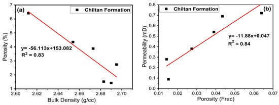 (a) Relationship between porosity and bulk density. (b) Relationship between permeability and porosity.