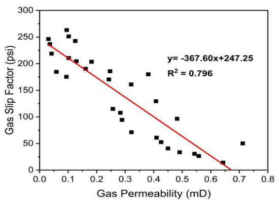 Here, b represents the Klinkenberg constant, also known as the gas slippage factor, and k∞ denotes the Klinkenberg or absolute permeability. The gas slippage factor b was determined using Equation (3) [52].