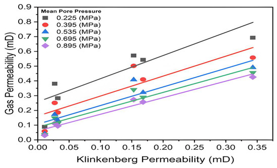 Relation between the corrected Klinkenberg permeability and gas permeability at different mean pore pressures.