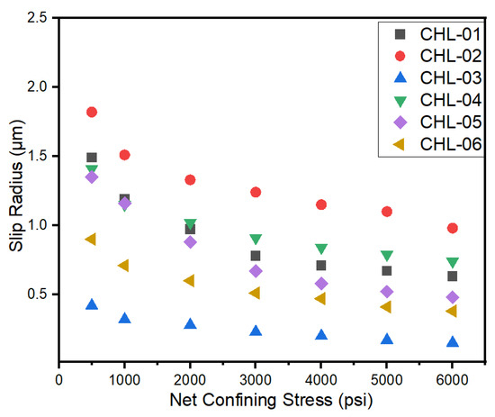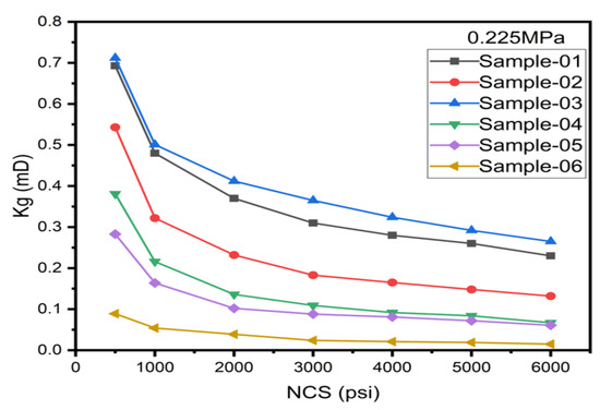 Tight permeability rocks are sensitive to stress and pore pressure, leading to gas molecules slippage at low pore pressures, resulting in an increase in the measured permeability. This slippage effect occurs due to the difference between the free path of the gas molecules and pore throat sizes [77,78]. To account for the gas slippage effects in low permeability cores at low pore pressures, the measured permeability is often corrected using the Klinkenberg permeability method in studies. Consequently, a practical method was established to calculate the Klinkenberg permeability and the gas slippage factor in the low-permeable Chiltan carbonate formation. Different empirical equations were utilized to determine the Klinkenberg-corrected permeability based on the observed pore throat geometries of the examined samples. Figure 11 illustrates the linear relationship between the permeability coefficients (Kg) and the reciprocal of the average pore pressure (1/Pav) under varying pore pressure conditions using Equation (1). The Klinkenberg permeability was determined by extrapolating the gas permeability line to zero. The obtained regression for the measured data was found to be satisfactory, with a coefficient of determination (R2) equal to 0.994. The gas permeabilities measured at various mean pore pressures and identified Klinkenberg permeability values of six carbonate core samples are provided in Table 3.