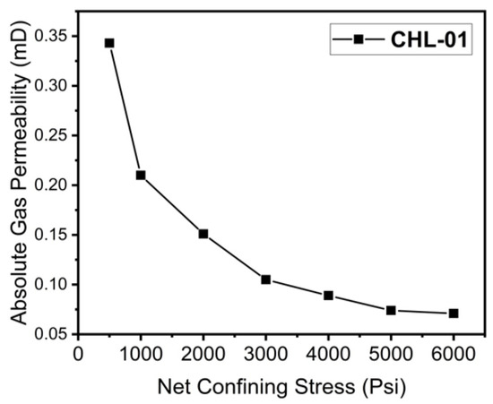 Overburden stress can significantly reduce the permeability of low-permeable reservoirs, with a profound impact on the pore morphology, geometry, and petrophysical properties. Carbonate reservoirs are particularly sensitive due to their complex lithofacies and diagenetic processes, which typically affects the reservoir quality and recovery [30]. According to the experimental findings using Equations (6) and (7), the gas permeability exhibits an inverse relationship and decreases with an increase in the net stress, as illustrated in Figure 14. This suggests that an increase in the net stress leads to a decrease in pore pressure, resulting in increased permeability due to the gas slippage effect. This effect allows gas to flow more easily through the pores. Furthermore, it was observed that an increase in the net stress resulted in a decrease in the absolute permeability, as shown in Figure 15.