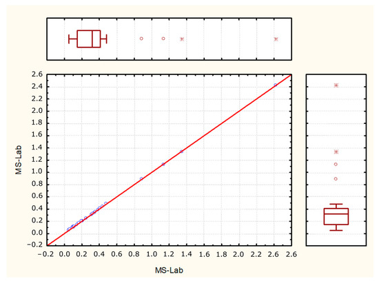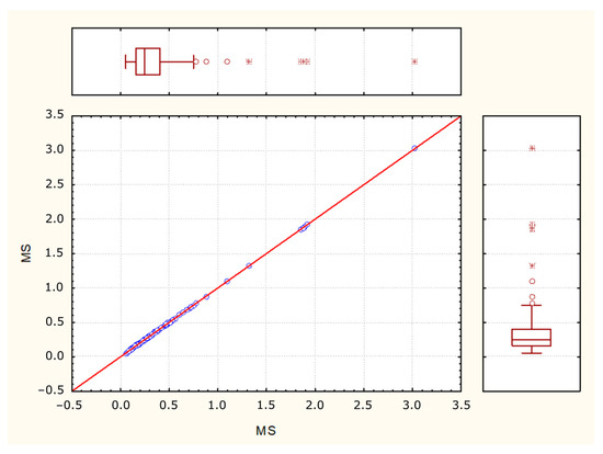 - Correlation analysis was performed by calculating Pearson’s correlation coefficient, which has been presented in the form of a correlation matrix and was used to determine the strength of the linear correlations between the mass fractions of analyzed elements and MS. The values obtained were statistically significant at p < 0.05. Pearson correlation assumes that the two variables are measured on interval scales, and determines the extent to which the values of the two variables are “proportional” to each other. The value of correlation (i.e., correlation coefficient) does not depend on the specific measurement units used. The presence of proportionality means the values are linearly related; that is, the correlation is strong if it can be “summarized” by a straight line (sloped upwards or downwards), which line is called the regression line or the least squares line because it is determined in such a way that the sum of the squared distances of all data points from the line is as low as possible.