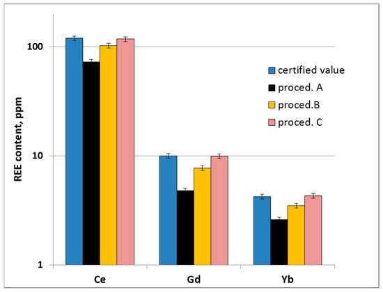 The determined values from a single microwave digestion in a mixture of concentrated HNO3 and HF, without fluoride removal, were lower than the certified value of approx. 35–40% (procedure A). When the diluted sample was evaporated with hydrochloric acid with the addition of 2 mL of 4% H3BO3, REE content was still lower than the certified values, with an average recovery of approx. 85% (procedure B). Quantitative determination was observed when 6 mL of 4% H3BO3 was added to the microwave vessel after the first step of digestion, and the second microwave complexification of residual fluorides occurred (procedure C).