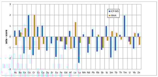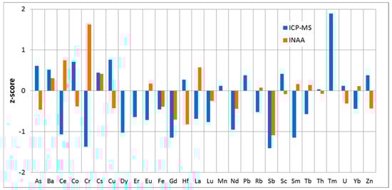 The z-score values presented in Figure 2 indicate |z—score|< 2, which means that the analytical results obtained by ICP-MS and INAA were within the ranges of certified data at a 99% confidence level.
