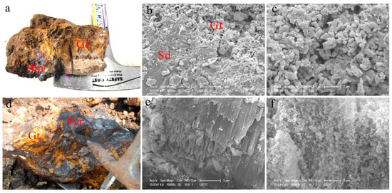 Macroscopic and microscopic (observed using SEM) morphologies of limonite ores collected from Xinqiao (a–c) and Yeshan (d–f). Xinqiao limonite ores contain mainly yellow goethite (Gt) and black to red hematite (Hm) (a). Goethite is the product of hematite hydration (a) and siderite (Sd) weathering (b). Sub-micron goethite particles in Xinqiao limonites show a spindle shape (c). The hand specimen shows the coexistence of yellow goethite and black pyrolusite (Pyr) in Yeshan limonite (d). Goethite in Yeshan limonite shows cluster (e) and flocculent (f) shapes.