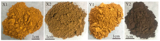 Before the experiments, natural limonites were crushed, ground, and sieved to obtain powders with a particle size below 200 mesh (<75 μm in diameter) (Figure 2). The powders were then washed with deionized water to remove soluble impurities and dried naturally. Specific surface areas were measured using a surface area analyzer (Nova 3000e, Quantachrome Instruments, Boynton Beach, FL, USA). Results (Table 1) show that Yeshan limonites have a much higher surface area than Xinqiao limonites. Surface potentials of limonite powders were analyzed on a Zetasizer Nano ZS90 (Malvern Instruments, Malvern, WR14 1XZ, UK) zeta potential analyzer. Results (Table 1) show obvious decreases in surface potential in the presence of Mn minerals.