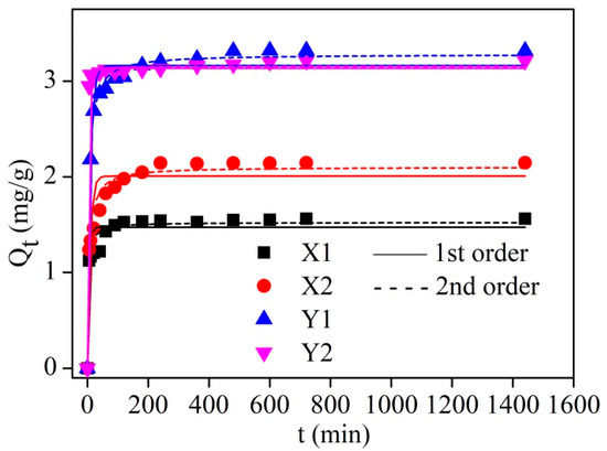 The adsorption data are fitted with pseudo-first-order and pseudo-second-order adsorption kinetic models (Appendix A). The fitted curves are shown in Figure 3, and the corresponding kinetic parameters are listed in Table 2. For X1 and X2, correlation coefficients (R2) indicate that the pseudo-second-order kinetic model is more suitable for describing the adsorption processes, while for Y1 and Y2 both models are suitable. Previous studies focusing on Sb(III) adsorption have shown that the adsorption kinetics depend highly on the properties of iron oxides [24,38,39,40,41,42,43]. As the main difference between Xinqiao and Yeshan limonites is surface area (13.8 and 12.7 m2/g for Xinqiao limonites, and 124.8 and 171.7 m2/g for Yeshan limonites) (Table 1), it is induced that the low surface area of Xinqiao limonites makes the adsorption rates to be constrained both by Sb concentration and the number of surface adsorption sites.