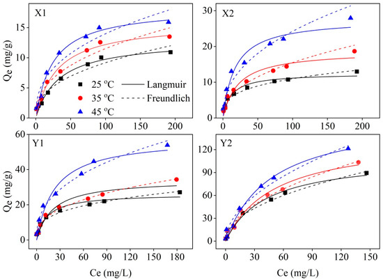 Adsorption isotherms (Figure 4) show that Yeshan limonites have much higher Sb(III) adsorption ability under the same conditions than Xinqiao limonites. This is likely derived from the surface area, where Yeshan limonites have a much higher surface area than Xinqiao limonites (Table 1). SEM (Figure 1) and TEM observations also show that most of the Fe and Mn minerals in Yeshan limonites are nano-sized, implying excellent adsorption potential [36,44]. In Figure 4, it is also observed that at the same temperature (25, 35, and 45 °C), the general Sb adsorption pattern is X2 > X1, indicating obvious adsorption enhancement by Mn oxides. As to Yeshan limonites, both surface area and Mn oxides could have contributed to Sb adsorption. Previous studies have demonstrated that due to much higher redox potential [45], Mn oxides, just as those in X2 and Y2, have a much stronger ability than iron oxides to oxidize Sb(III) to Sb(V) [28,29,30,31]. Sb(V) is usually presented as Sb(OH)6− and thus is easily chemically adsorbed by iron oxides, which have a positive surface charge under low pH conditions [1,13]. Furthermore, temperature is an important parameter of Sb adsorption. The adsorption capacities increase with temperature.